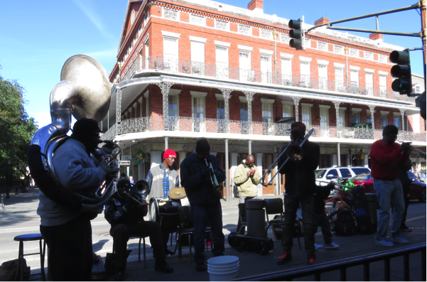 I saw a lot of people in very brief encounters over the last week as I was on a road trip down South. This was my view at breakfast on Wednesday morning: a genuine New Orleans street band playing in front of a café full of people. And I got a front row seat. The band played songs like ‘Just a Closer Walk with Thee’, and the lead singer had a voice like Louis Armstrong, and could play the trumpet, too. Sitting in the warm sunshine, eating a beignet, and hearing the Dixieland jazz music made my day!
