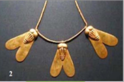 Flies in ancient Egypt represented tenacity and courage. Soldiers received pendants with flies on them for their bravery in battles. A gold chain with three flies was in the tomb of Queen Ahhotep I and is not in the Egyptian museum in Cairo. Smaller fly pendants are found on mummy beads. Flies made of gold, pottery, glass or precious stones were worn as amulets to protect yourself against flies.[19]