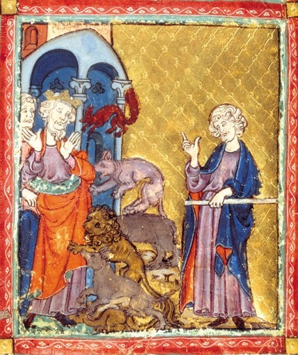 The Golden Haggadah, 14th century, Spain, British Library, Fourth plague-lice, “arov” (wild beasts)