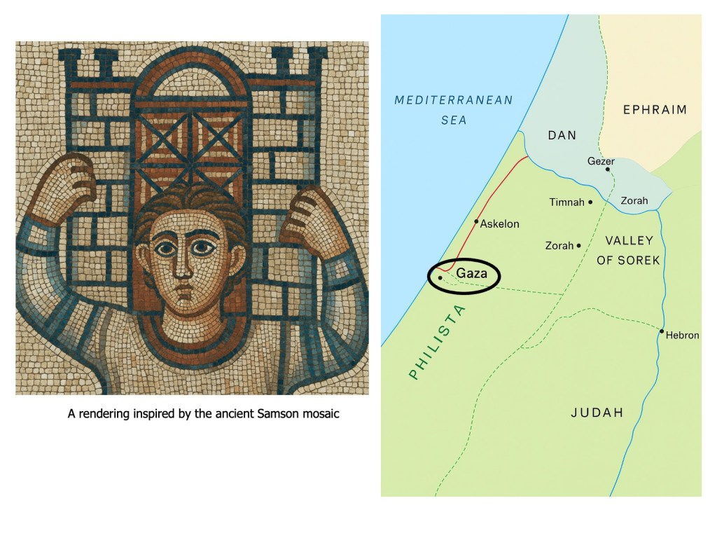 A mosaic depicting Samson was found in an ancient Jewish village in 2013. It shows him carrying the gate of Gaza on his shoulders.[8] Gaza is another Philistine city. While the Israelites were settling in the highlands, the Philistines in the southern coastal plain were building complex cultural and commercial centers in their Iron Age Pentapolis.[9] Samson’s parents might have called them ‘uncircumcised Philistines’, as a jab, but they had a very distinct cosmopolitan civilization—with art, pottery, and well-planned cities. Samson has a bounty on his head.[10] As soon as the Philistines hear he’s in Gaza, the ambushers gather—confident he’ll stay in the woman’s room until morning. But Samson gets up in the middle of the night. Then he takes the city gate and gateposts with him.