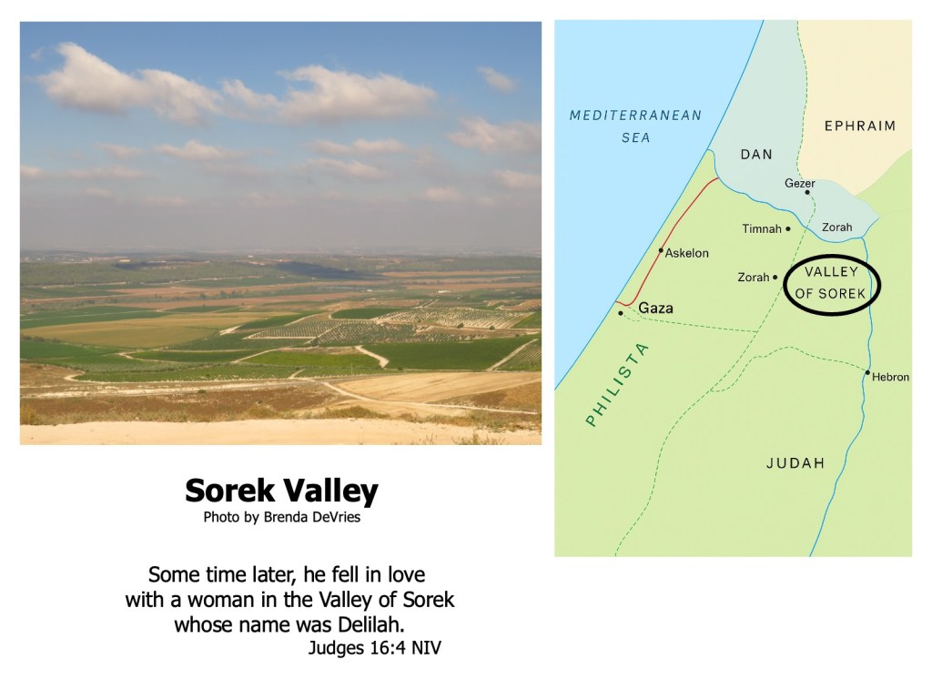 Delilah is from the Valley of Sorek, which is a wadi valley in the foothills of Judah and Dan and runs westward toward the Mediterranean coast.[24] I took this picture from the top of Zorah, Samson’s hometown, and overlooking the Sorek Valley. In the distance is the coastal plain. The Sorek Valley today has vineyards, orchards, crops and olive groves—something that Samson destroyed when he tied those jackals’ tails together in the last episode. We can’t tell if Delilah is a Philistine or an Israelite.[25] She is simply a “woman in the valley”. The Sorek Valley is Israelite territory,[26] under Philistine rule.